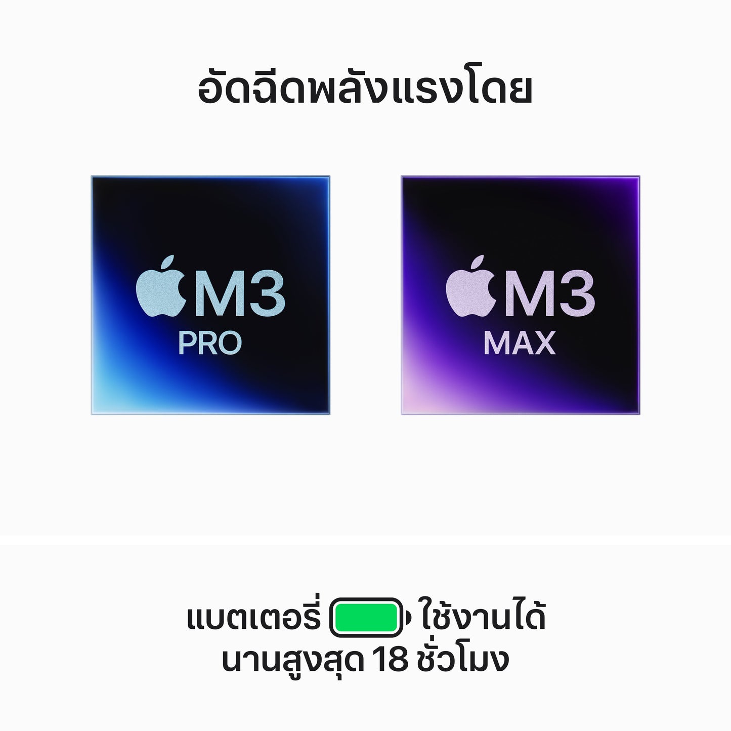 หน่วยความจำแบบรวมและตัวจัดเก็บข้อมูลที่ตอบสนองทันใจ — หน่วยความจำแบบรวมขนาดสูงสุด 36GB (ชิป M3 Pro) ช่วยให้ทุกสิ่งทุกอย่างที่คุณทำรวดเร็วและลื่นไหลไปหมด ตัวจัดเก็บข้อมูลแบบ SSD ความจุสูงสุด 4TB (ชิป M3 Pro) ที่เร็วแบบสุดแรงให้คุณเปิดแอปและไฟล์ได้ในพริบตา2
