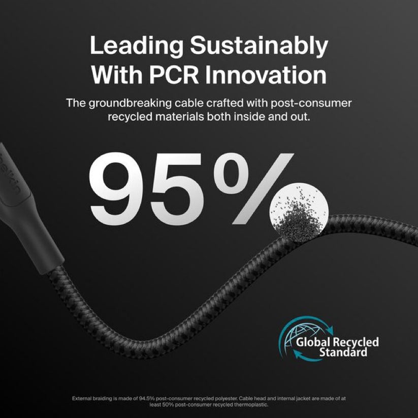 95% PCR PET exterior braiding; 50% PCR TPE material in cable boot, strain relief and jacket help to reduce plastic waste without compromising charging performance