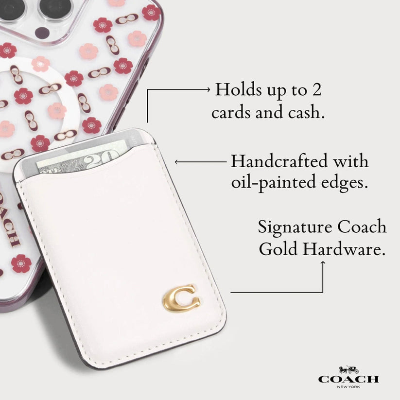 Crafted with genuine Italian leather and finished with Coach’s Signature hardware, this magnetic card case holds up to two cards and cash with thoughtfully designed cutouts to easily remove your essentials. Bring luxury to your everyday accessory with built-in magnets that snap on and off of your phone case. Detachable Magnetic Connection for Wireless Charging. Strong Built-In Magnets for MagSafe.