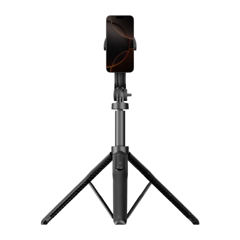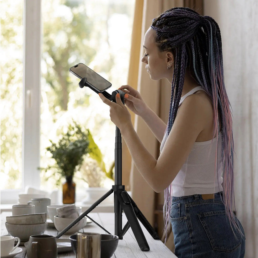 The Momax 1-Snap Pole selfie stick doubles as a tripod, offering easy setup with attachment provisions for iPhone and Android devices, adjustable height, flexible angles, and detachable remote control for wireless snapping.