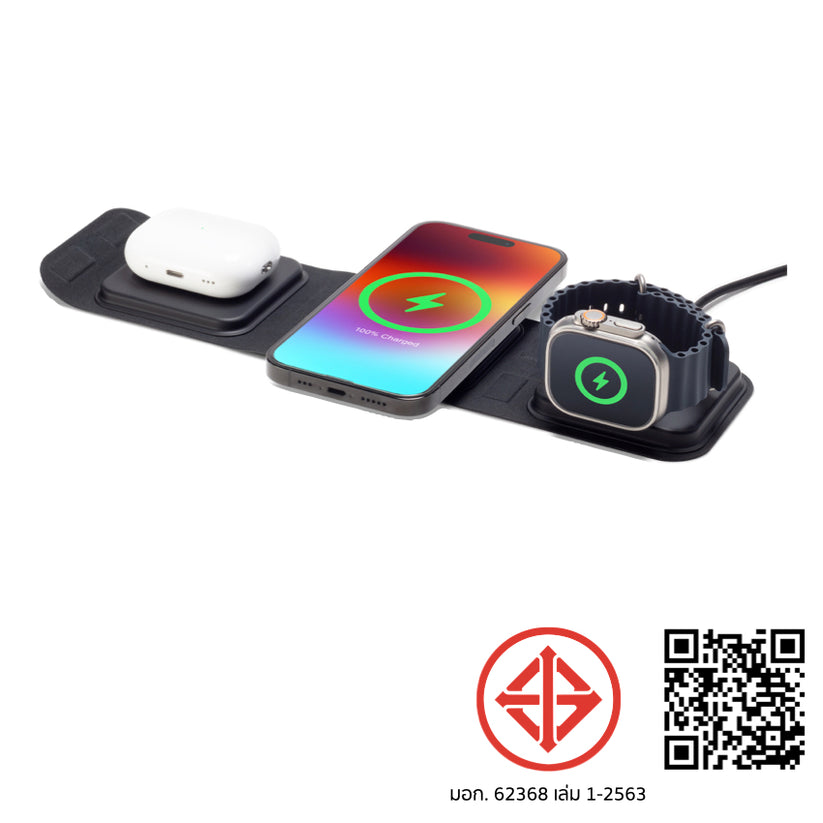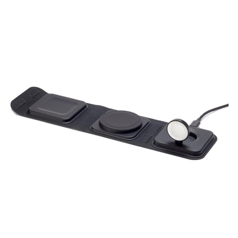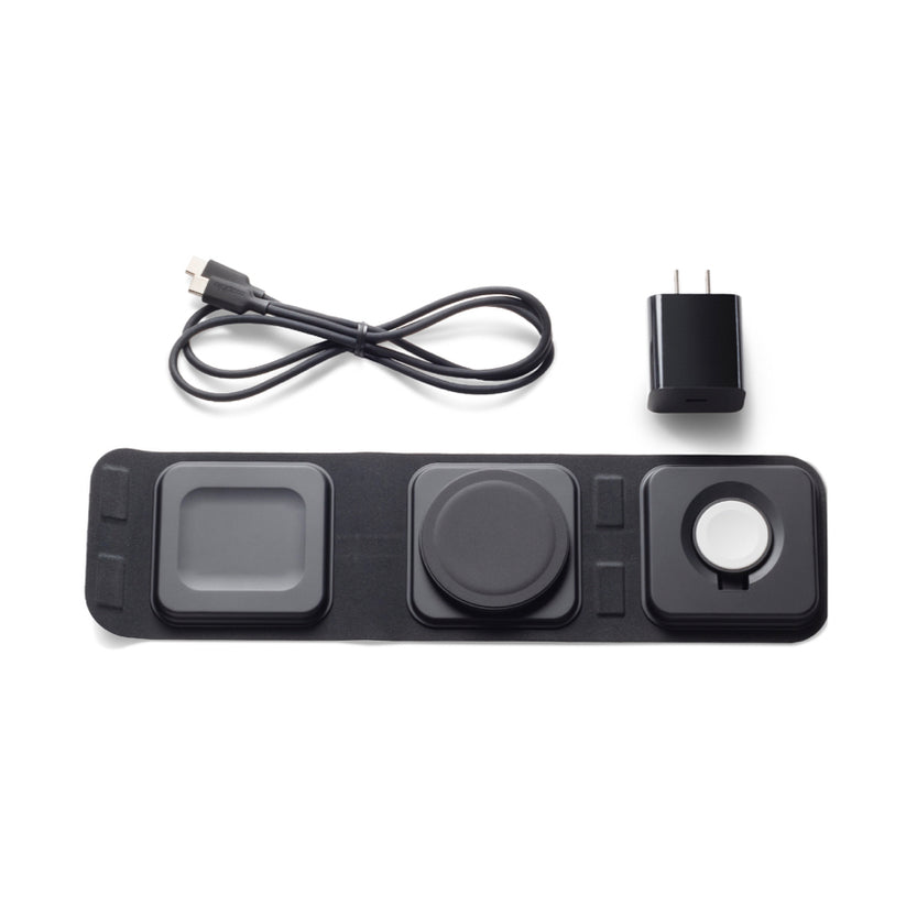 The 3-in-1 travel charger folds up neatly and fits into a compact travel case. Simply unpack and unfold to turn any surface into a charging hub.