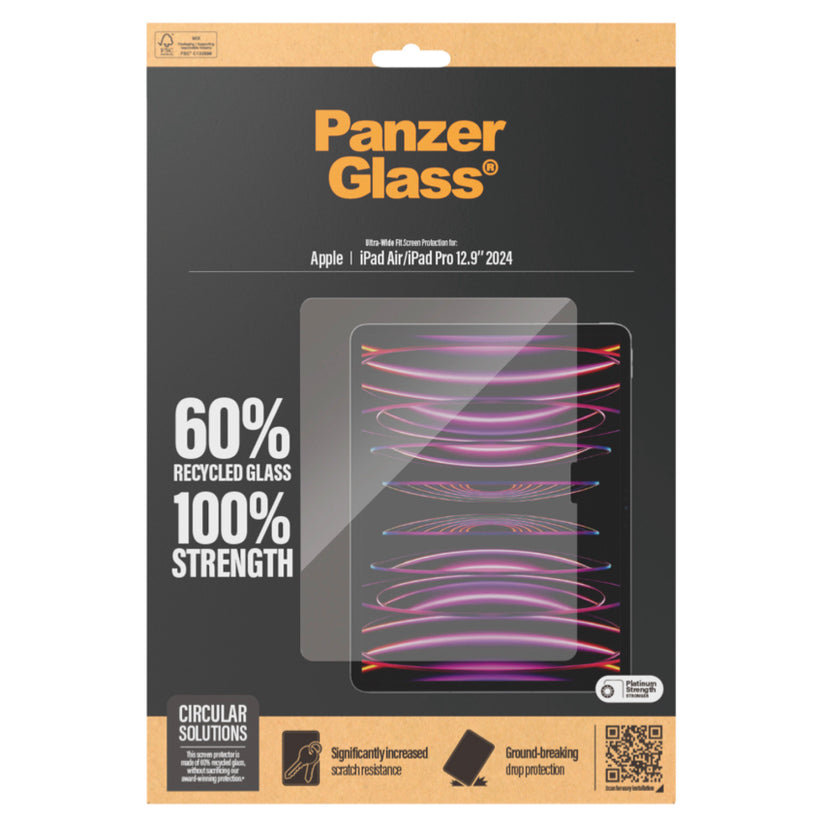 The Ultra-Wide Fit screen protector covers the entire front surface of your iPad, while still leaving room for a case. It provides a complete and crystal-clear view of your screen and comes in FSC-certified packaging that can be recycled.