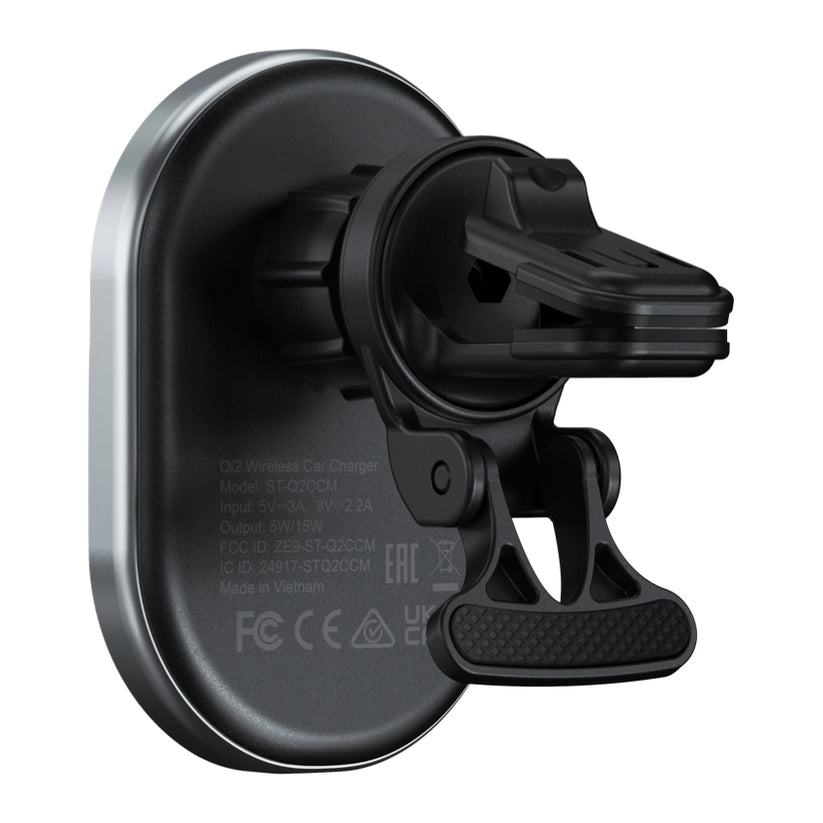 Charge your phone on the go with the Satechi Qi2 Wireless Car Charger. Driven by the latest fast charging technology, it delivers 15W of power for a fast, efficient charge. With a stabilizing vent clamp and a powerful magnetic connection that keeps your phone secure during travel. Includes a 3.3’ USB-C cable and a 25W Cigarette Light Adapter (CLA) for easy and immediate use in most vehicles. Featuring a sleek profile, a soft silicone charging puck, and sturdy hinges that won’t weaken over time.