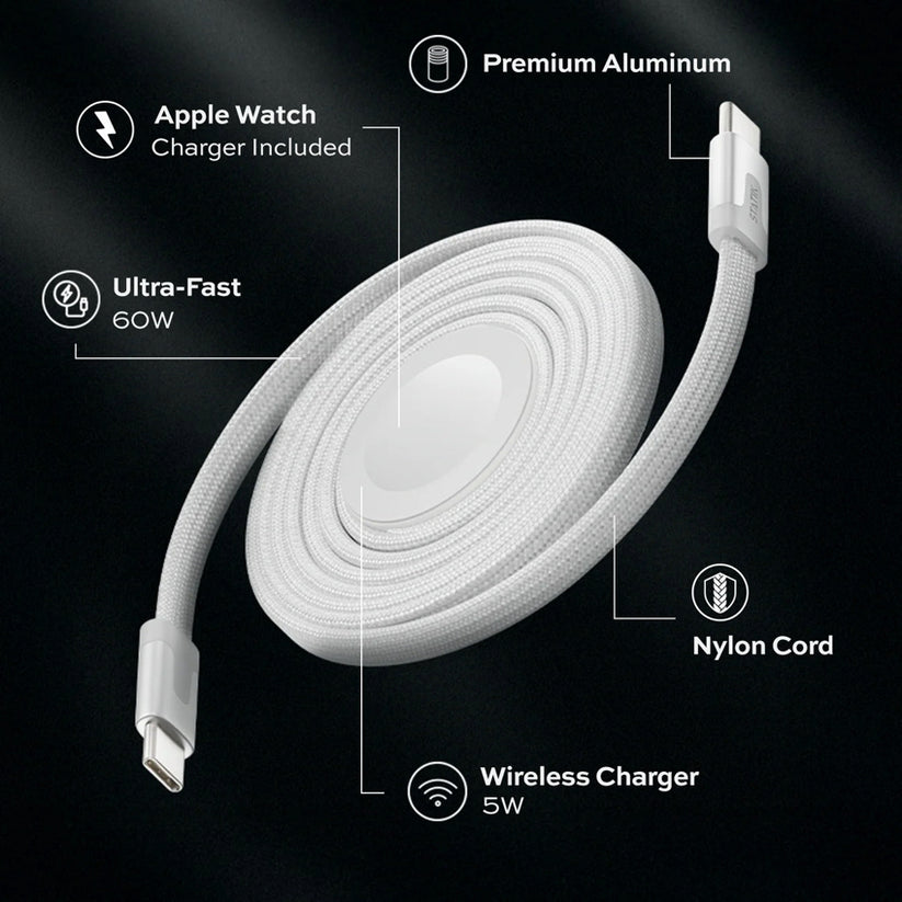 Both the USB-C cable and the wireless Apple Watch charger are built for speed and durability. The 60W Cable and the 5W Wireless Charger both deliver ultra-fast charging speeds to your devices.