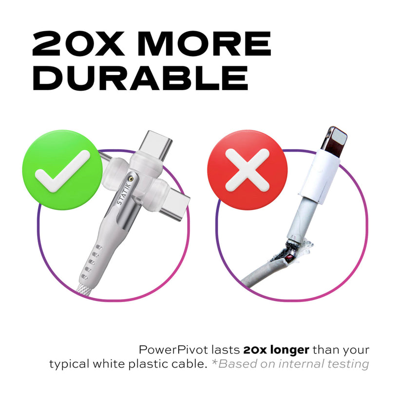 20X MORE DURABLEThe PowerPivot Pro head has been tested to withstand 20,000 turns, making it 20x more durable than a standard white PVC cable. |