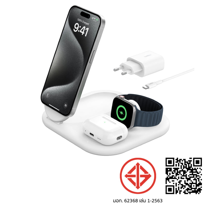 BELKIN Boost Charge Qi2 3 in 1 Magnetic Foldable Wireless Charger แท่นชาร์จไร้สายพับเก็บได้ มีเทคโนโลยี Qi2 ชาร์จเร็วสูงสุด 15 วัตต์ รองรับ MagSafe ในตัว และ สามารถชาร์จ iPhone, Apple Watch และ AirPods พร้อมกันได้ในที่เดียว สามารถปรับมุมมองได้ ทำให้การชาร์จเป็นเรื่องง่ายขึ้นกว่าเดิม นอกจากนี้ยังมีแม่เหล็กยึดติดแน่นหนา ไม่หลุดง่าย และ ฐานป้องกันลื่นได้อย่างดีเยี่ยม ดีไซน์พับเก็บได้ง่ายสะดวก พกพาไปได้ทุกที่ มาพร้อมหัวชาร์จ 36 วัตต์ และ สายชาร์จ USB-C to USB-C ความยาว 1.5 เมตร เหมาะสำหรับผู้ที่ต้องการความสะดวกสบาย และ เทคโนโลยีที่ล้ำสมัย จากแบรนด์ชั้นนำ BELKIN